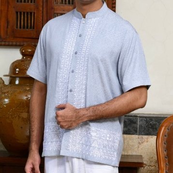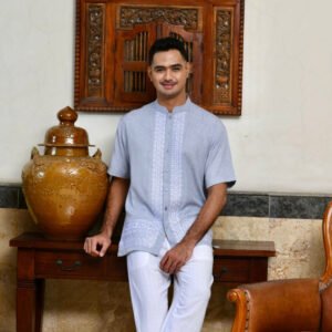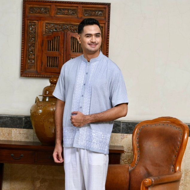 – Baju koko lengan pendek bernuansa light tone dengan detail bordir modern classic