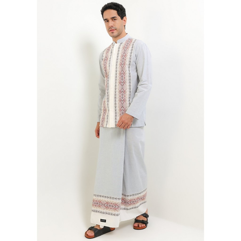 – Sarung motif tenun dengan desain colorblock untuk kesan modern minimalist