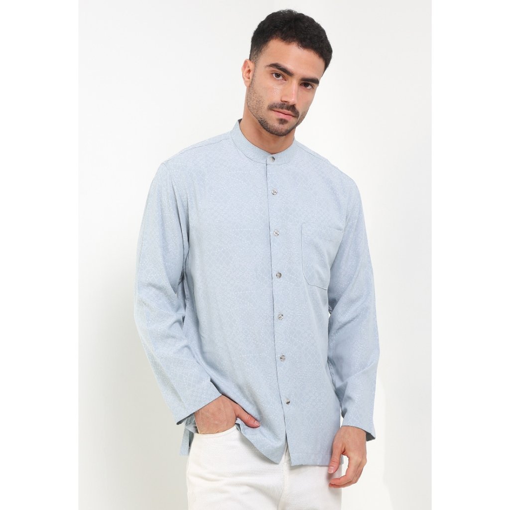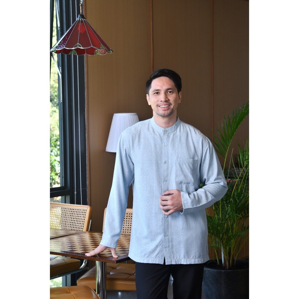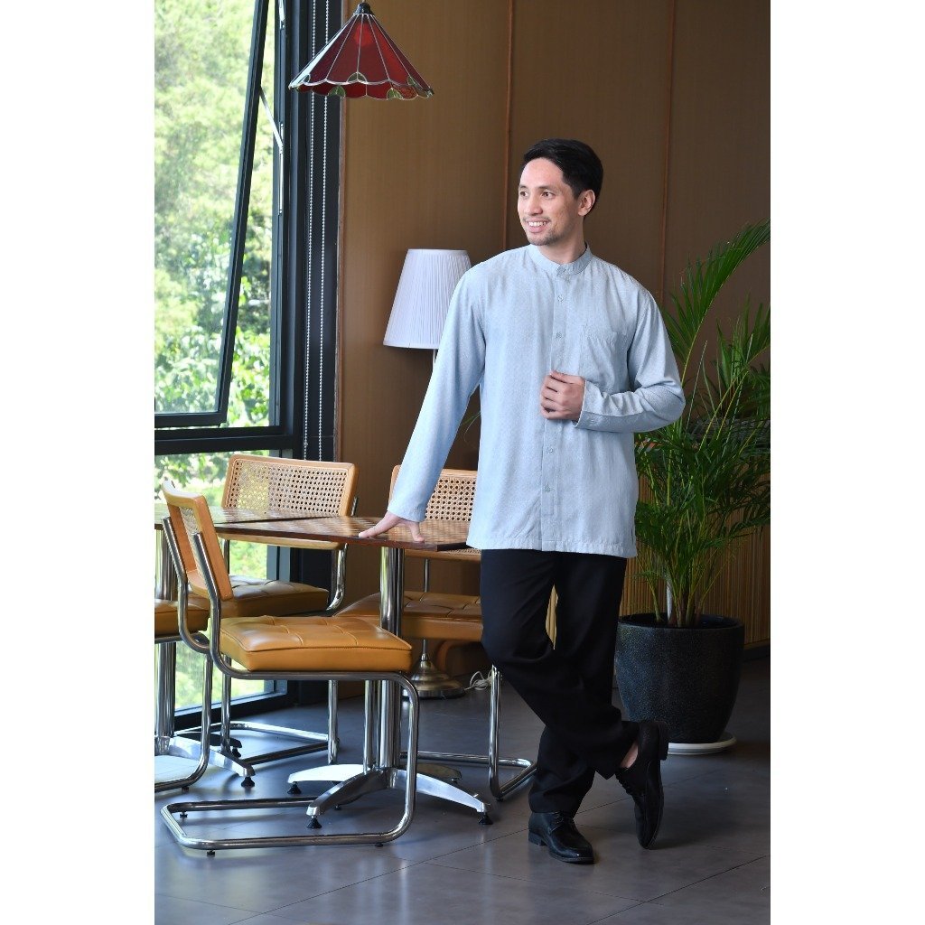 – Baju koko lengan panjang warna solid dengan detail graphic print