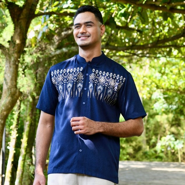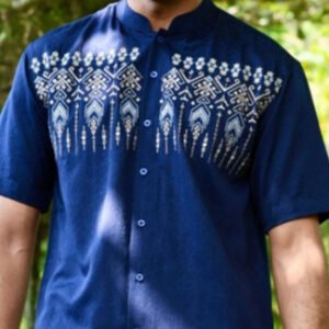 – Baju koko lengan pendek bernuansa dark tone dengan detail bordir modern classic