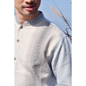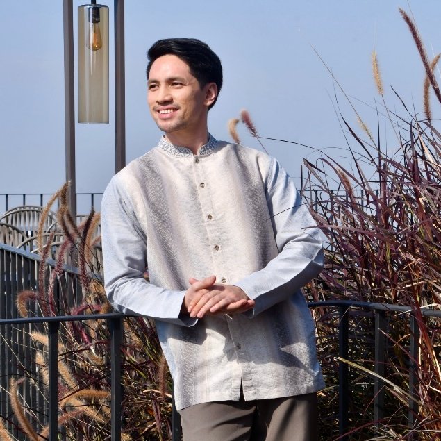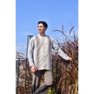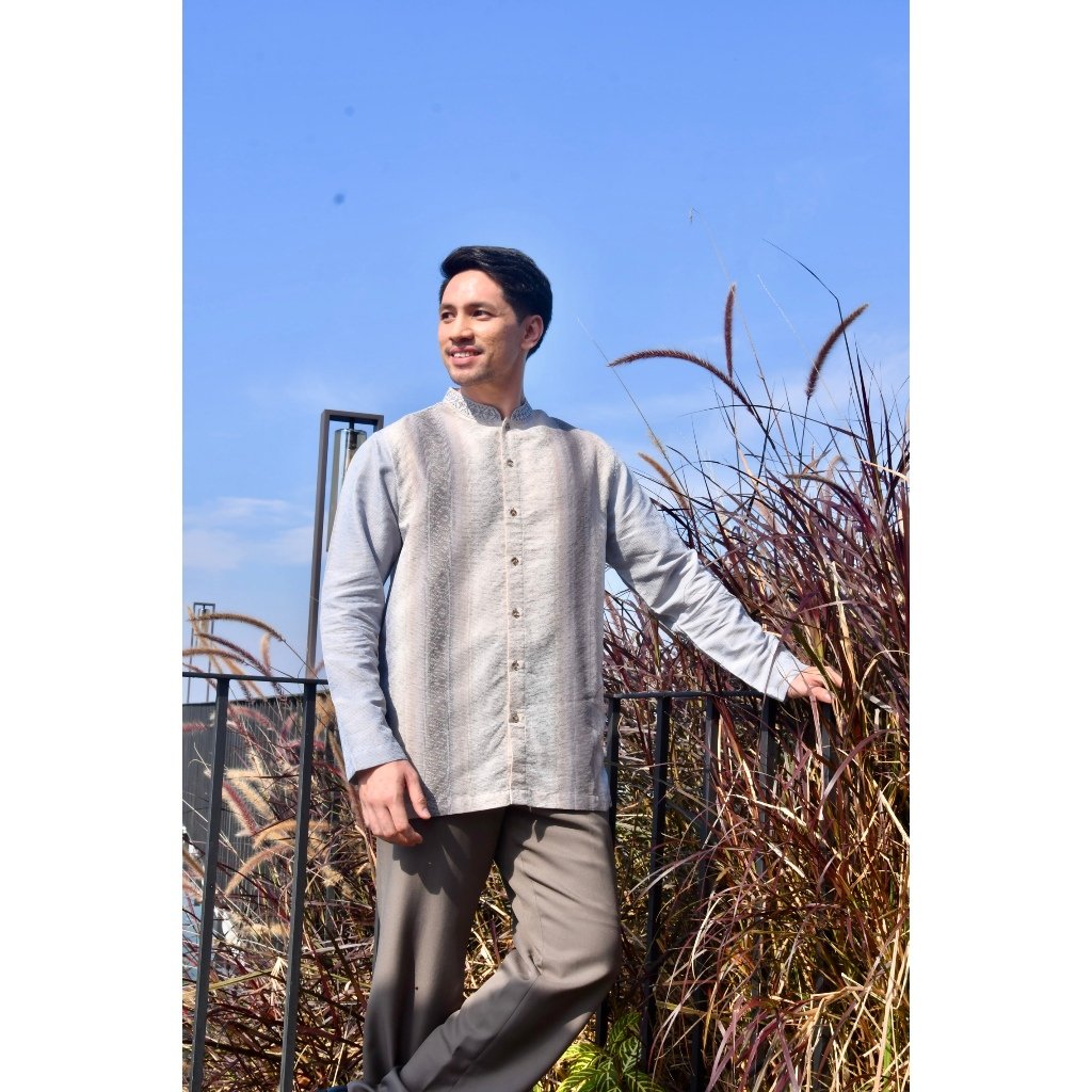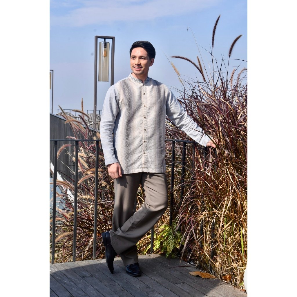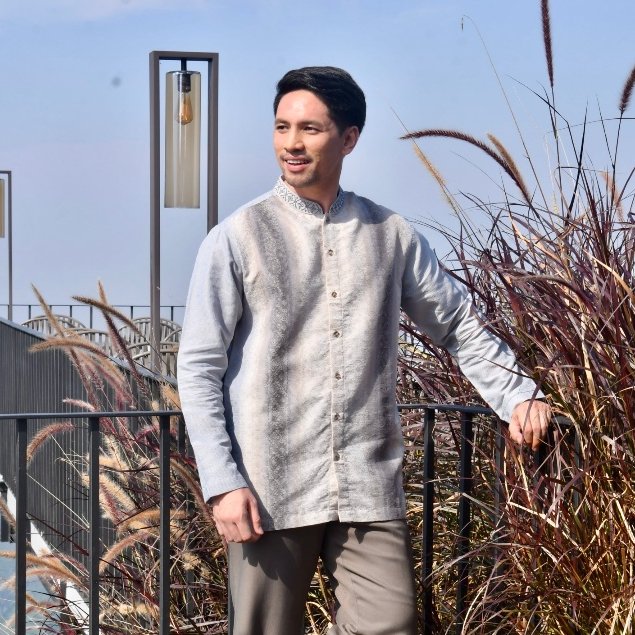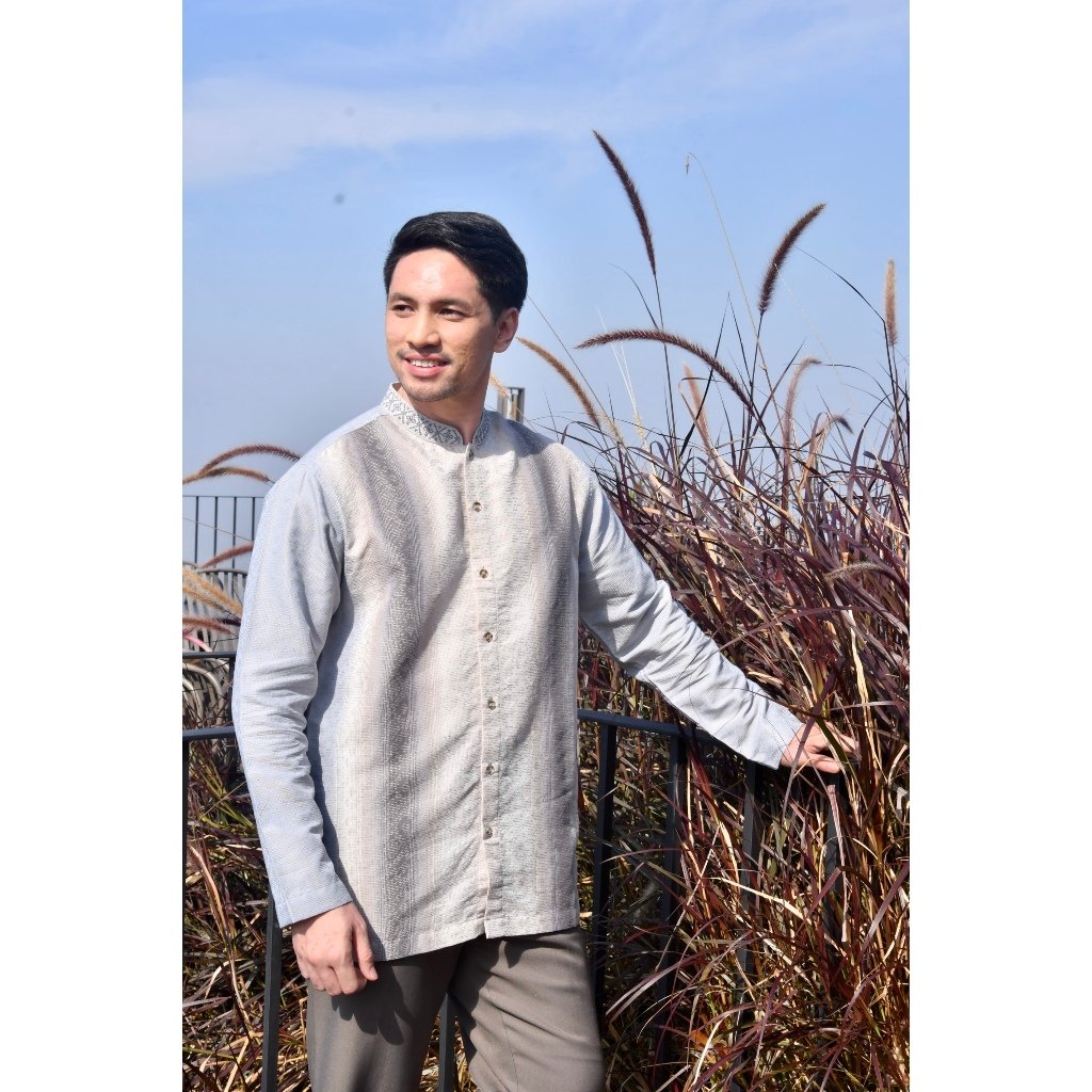 – Baju koko lengan panjang dengan motif dobby untuk modern classic look