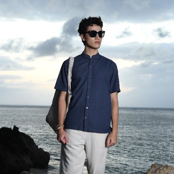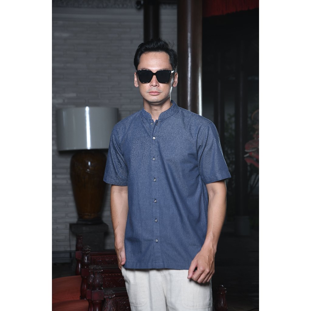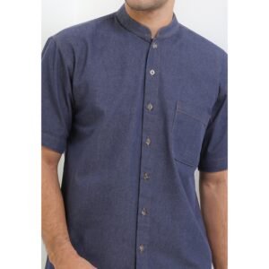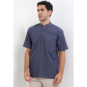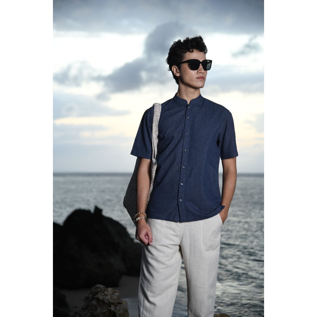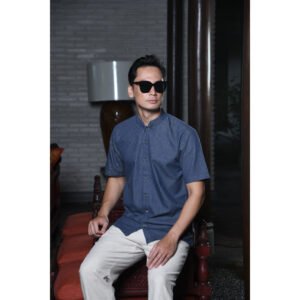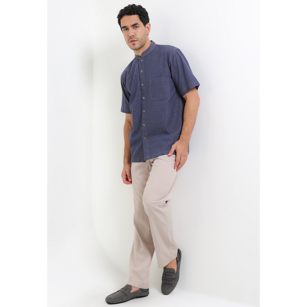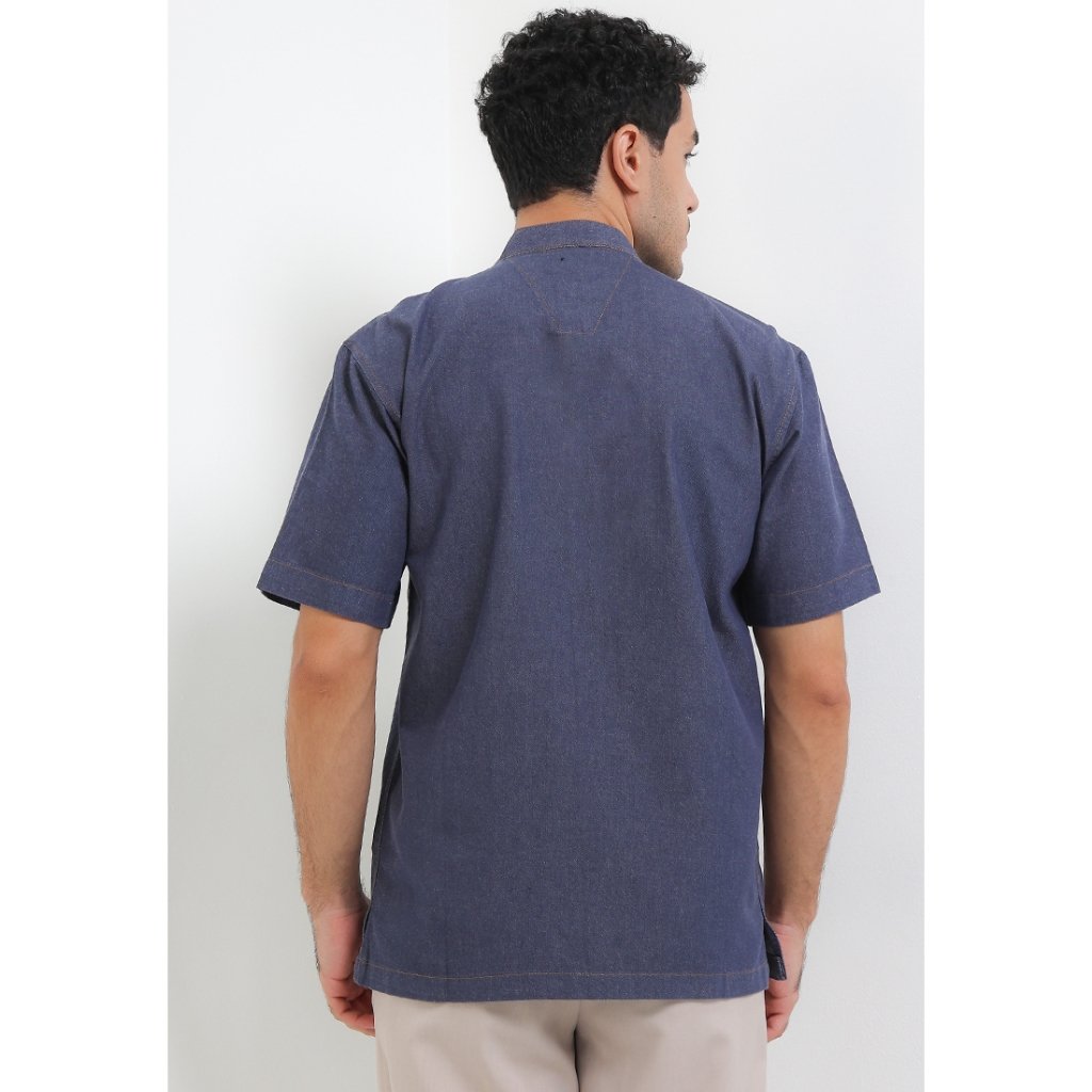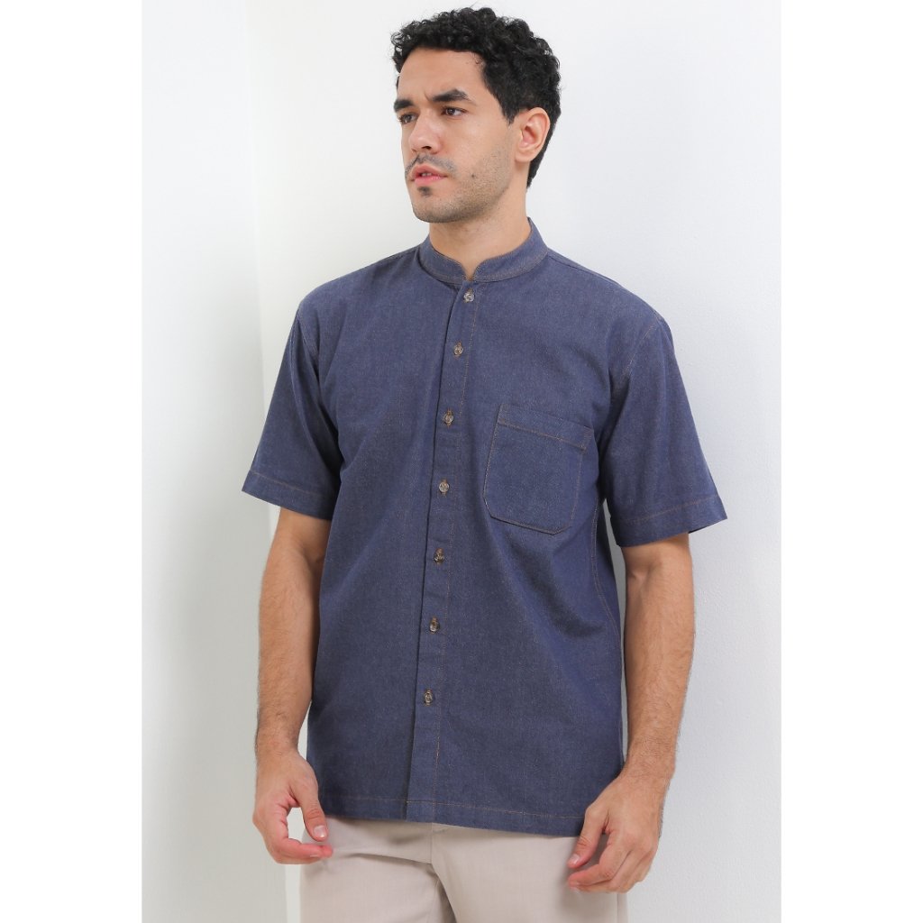 – Baju koko denim warna solid untuk modern casual look