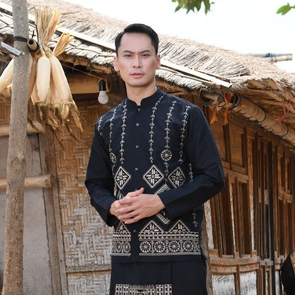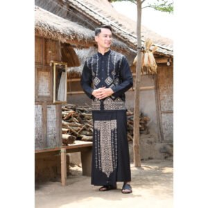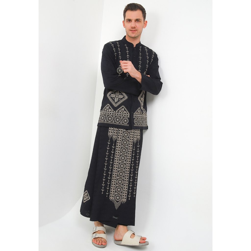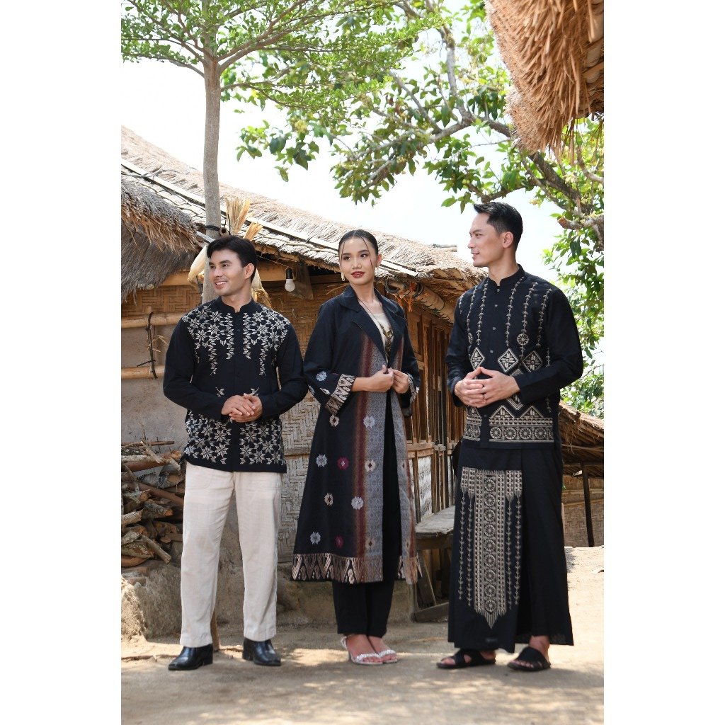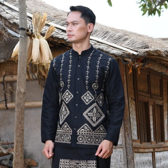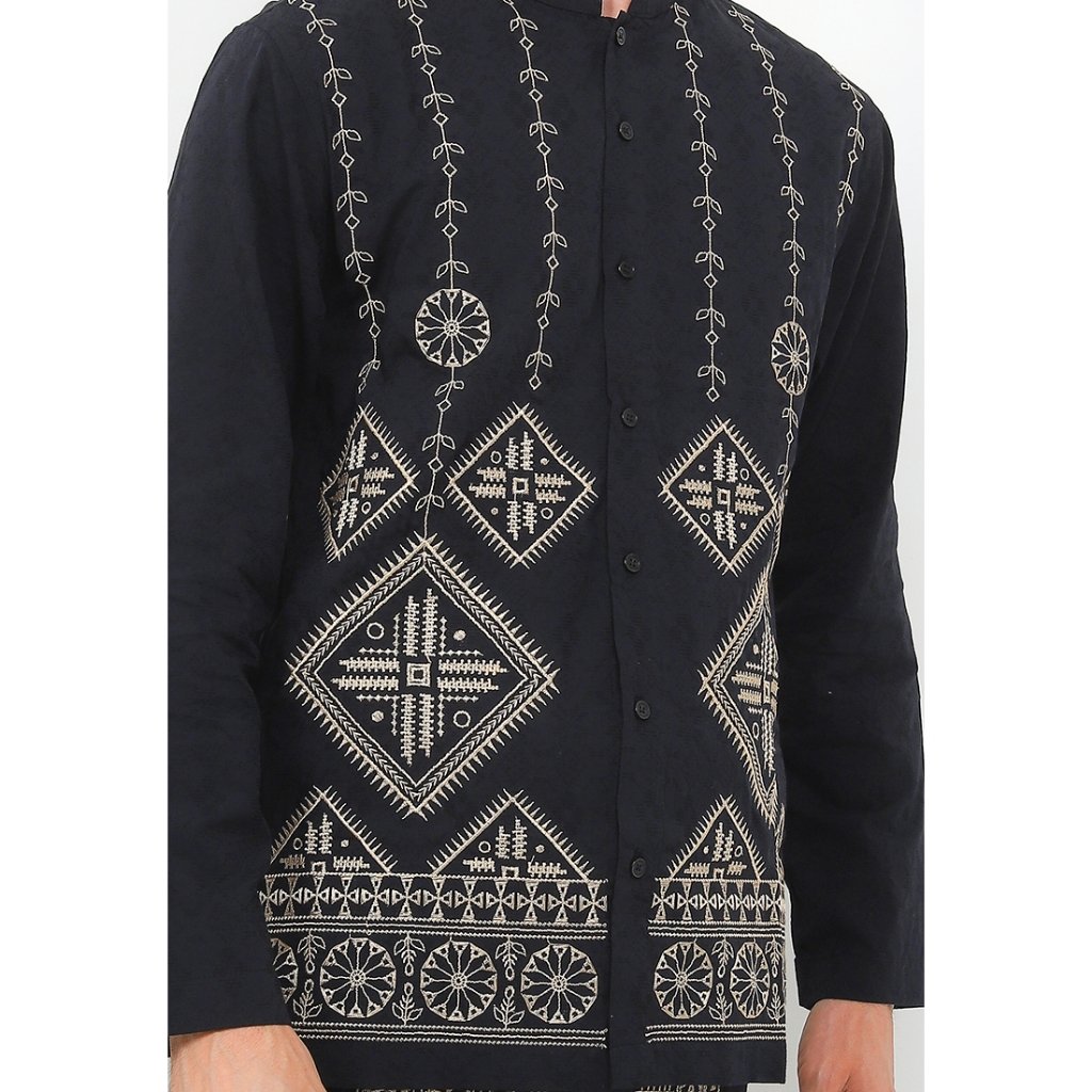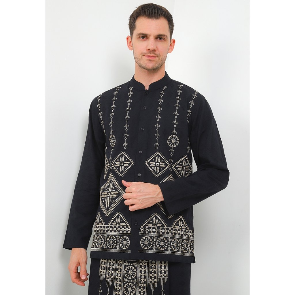 – Baju koko dengan motif bordir dalam nuansa monokrom