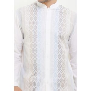 – Baju koko desain modern ethnic dengan detail graphic embroidery